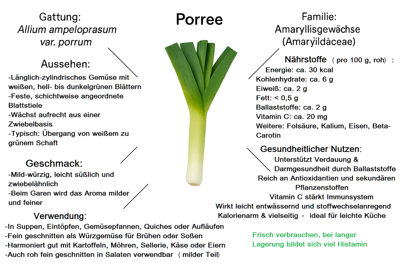 Porree, Kartoffeln, Zwiebel und Brühe weich kochen, pürieren und mit etwas Sahne oder Milch verfeinern.